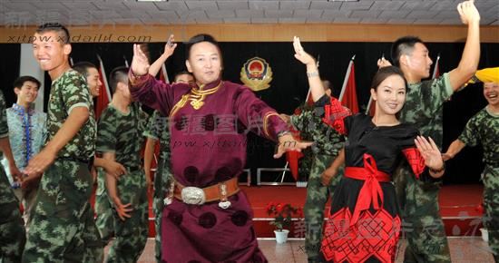 2013年7月31日,巴音郭楞蒙古自治州蒙语影视译制中心的工作人员和战士们跳起蒙古族民间舞蹈《萨吾尔登》。当日,该译制中心的工作人员带着慰问品来到武警兵团指挥部第二支队,与战士们一起欢庆“八一”建军节。