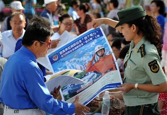2013年8月16日,在库尔勒市人民广场,武警巴音郭楞蒙古自治州消防支队库尔勒市大队古力孜热·司马义向前来咨询的市民散发宣传资料。当天,巴州在库尔勒市人民广场开展了《新疆维吾尔自治区实施“中华人民共和国突发事件应对办法”办法》一周年宣传活动。
