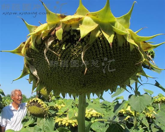 2013年7月30日,新疆生产建设兵团第八师143团18连职工王怀富在检查油葵成熟情况。王怀富今年引种4亩美国矮大头油葵新品,经科学管理,巧施肥,油葵喜获丰收,亩产在300公斤以上。该品种不仅产量高,而且出油率在40%以上。