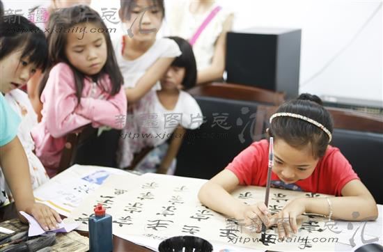 2013年7月30日,在乌鲁木齐市北园春社区的会议室里,上完折纸课的小朋友,在看一个小伙伴写毛笔字。据了解,该社区辖区内自建房较多,居住人口大多为外来务工人员。暑期的到来,致使大部分外来务工子女无人看管。于是,该社区协同社区志愿者服务队共同举办了《快乐假期 社区课堂》活动,使得孩子们的假期有了一个让家长放心的去处。