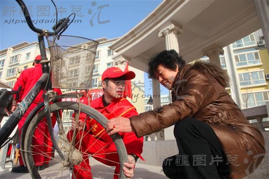 3月1日,库车县塔里木运输公司的青年志愿者在为社区居民修理自行车。