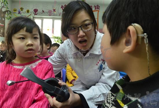 2014年3月1日,医生在为小朋友讲解爱耳护耳知识。