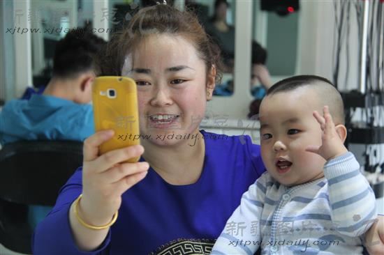 2014年3月2日,小朋友理完发后,孩子的母亲拍照留念。