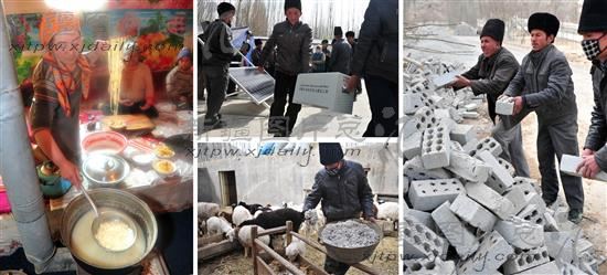 3月1日,于田县阿羌乡皮什盖村村民阿热古丽在安居富民房中为家人准备晚饭(左);村民在领取太阳能发电装置(中上);村民在羊圈内为羊群添加饲料(中下);地震中房屋受灾严重的村民在摆放新领取到的灾后重建材料。