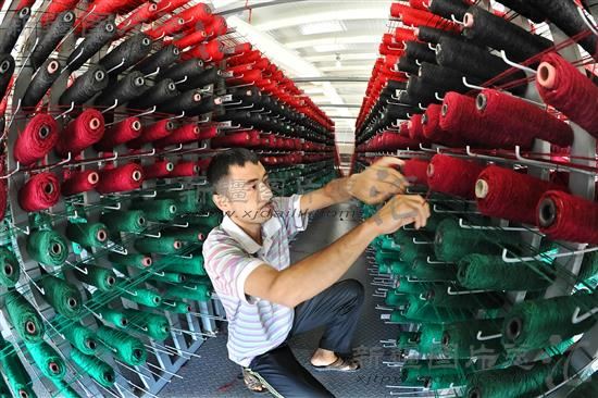 2013年8月16日,工人在管理毛线整理设备。霍城县代吾然地毯厂是以纯羊毛为原料,将维吾尔族传统手工艺与现代编织工艺相结合的民营企业,年产地毯8万平方米。企业现已吸纳130余名下岗职工、残疾人,带动了周边300多人就业。产品大都销往哈萨克斯坦等中亚市场。
