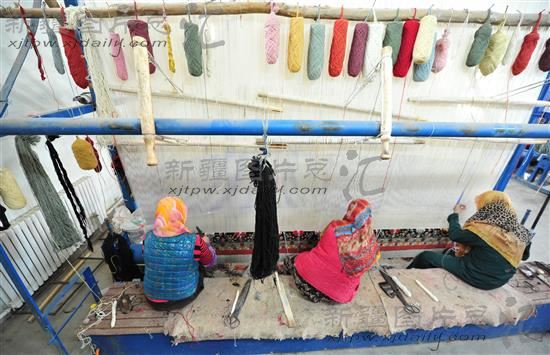 2014年3月2日,村民在新疆于田县科克亚乡地毯厂编制地毯。地震后,科克亚乡群众积极开展自救,现已基本恢复了正常的生产生活,刺绣、地毯编制等特色手工艺产业现已恢复至震前水平。
