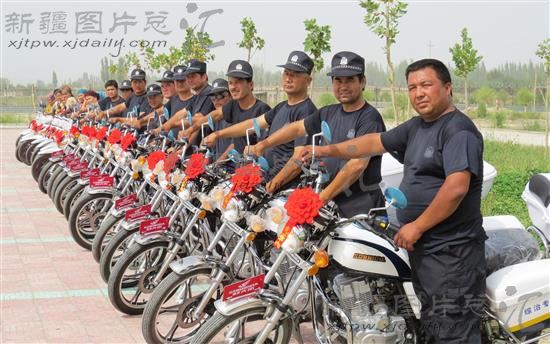 2013年8月1日,新疆阿克苏地区沙雅县央塔克协海尔乡为村治保主任配发治安巡逻摩托车。为提高治安联防队伍在巡逻和处理突发事件中的反应能力,该乡拿出8万余元,为辖区村治保主任统一购置24辆治安巡逻摩托车。