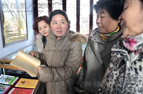 2014年3月5日,乌鲁木齐文庙讲解员在为观众介绍一本上世纪70年代创作的有关雷锋事迹的书籍。