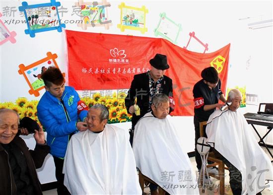 近日,裕民县哈拉布拉镇的社区青年志愿者服务队走进该县敬老院义务为老人理发,帮助老人整理房间,与老人聊天,用实际行动关爱老人。