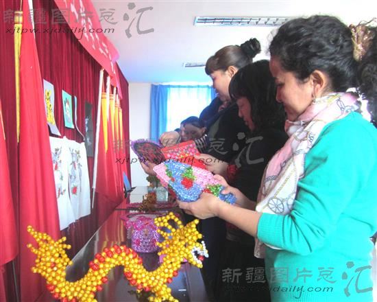 2014年3月5日,新疆塔城地区裕民县哈拉布拉镇各族妇女在参观手工艺作品展。在“三八”国际劳动妇女节到来之即,裕民县妇联组织举办了女性“靓丽工程”手工艺作品展,展会上共展出了该县各族妇女送来的民族刺绣、布艺、珠串、绢花等各类精美的手工艺作品300多件。
