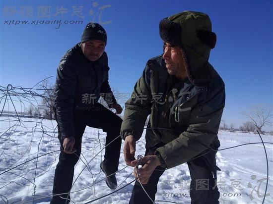2014年3月5日,新疆阿勒泰地区富蕴县杜热乡农牧民积极做好拉网防汛等工作。近日,气温回升,为防止融雪型洪水的发生,富蕴县提前做足准备,及时采购了防汛物资,对容易发生洪水的龙口压坝、河道护坡等进行了及时的修理和防护。