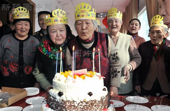 2014年3月6日,乌鲁木齐市黑甲山片区后街社区各族妇女一起吹灭生日蜡烛。