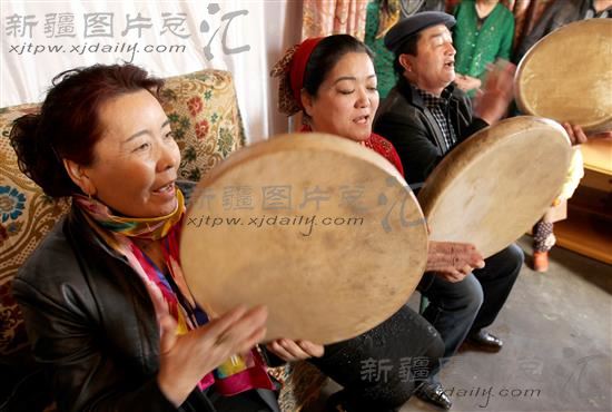 3月7日,新疆哈密市回城乡沙枣井村各族群众打着手鼓欢唱木卡姆。