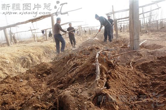 2014年3月8日,新疆吐鲁番市葡萄乡木纳尔村的农民准备将埋在地下的葡萄藤挖出来,搭上葡萄架。