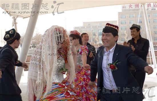 当日。吐鲁番市葡萄乡一对新人,在亲朋好友及围观的市民、游客祝福下喜结连理。