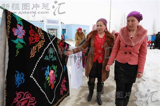 2014年3月8日,富蕴县杜热乡索依勒特村的妇女在观赏刺绣品.