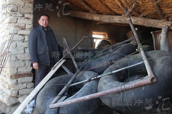 在龚贵生的煤房里,放着一个由三个拖拉机内胎做的皮筏子。三个充着气的大内胎牢牢的绑在焊接的钢管上。这是1989年,龚贵生制作的一个简易的“船”。十几年间这个简单的“船”载着全村百十个孩子、老人无数次渡过额尔齐斯河。