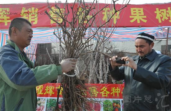 2014年3月12日上午,在新疆库尔勒市栏杆路一家苗木市场,一位购客拿手机对果树苗木进行拍摄。随着天气回暖,新疆库尔勒市各苗木市场生意逐渐红火,前来购买桃树、枣树、葡萄树等果树苗的群众络绎不绝。