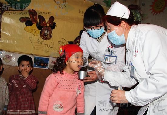 2014年3月12日,第一轮脊髓灰质炎集中强化免疫接种活动开始,库车县卫生系统抽调460余名城乡医务人员,分为64个固定点,120多个流动点对全县3.3万名2月龄至4岁儿童免费接种脊髓灰质炎疫苗,并要求医务人员走进社区、幼儿园、农户家中喂服糖丸。图为:库车县人民医院疫苗接种人员在该县第三幼儿园为儿童接种疫苗。(黄凤莲 摄)