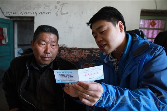 2014年3月12日,新疆阿勒泰地区福海县齐干吉迭乡加郎阿什村住村工作组的干部正在给村民发放便民服务卡。
