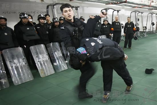 3月14日,在乌鲁木齐市公安局特警八支队的室内训练场,特警队教官向社区巡逻队队员教授徒手格斗技能。