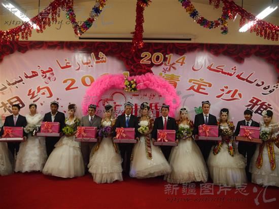 2014年3月15日,新疆阿克苏地区沙雅县沙雅镇在景旁街社区公共服务中心举办“相约2014、情定沙雅”集体婚礼,树立婚姻新风尚。