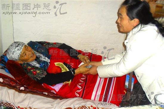 2014年3月14日,新疆塔城地区裕民县住城镇社区的工作队成员郑东(右)慰问患病居民。当日,裕民县哈拉布拉镇喀拉乔克街社区住社区工作队成员带着大米、清油等生活物品走访慰问社区困难居民。