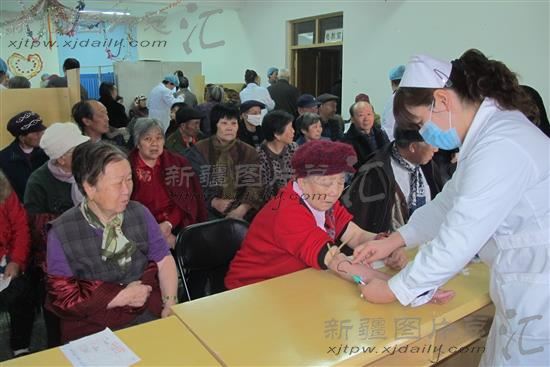 2014年3月17日, 新疆生产建设兵团第八师143团医院在为花园镇社区老年人免费体检。为完成全团4000多名65岁以上老年人的免费体检,该院组织20多位经验丰富的医务人员,由副院长雷文杰负总责,毎天体检120人以上,计划两个月完成体检任务。