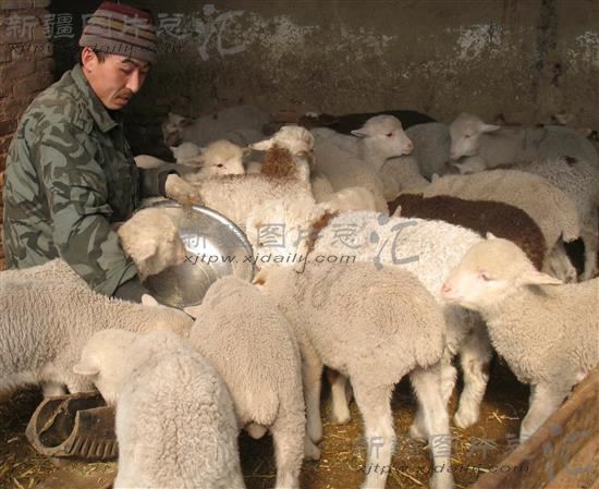 2014年3月17日,新疆生产建设兵团第八师143团紫泥泉哈萨克族牧工库马尔在给羊羔喂饲料。今年紫泥泉牧区通过舍饲圈养提高冬春羔成活率,大力推广暖圈养殖、长草短喂、人工补饲等一系列新技术,全力抓好接羔育幼和疫病防治工作,目前,8000只母羊产羔工作巳全部结束,共成活羔羊8000只,首次实现百羊百羔的历史最好成绩。
