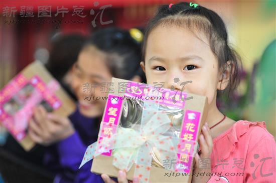 2013年9月15日,4岁的阳云竹在展示获赠的月饼套装。当日,乌鲁木齐市水磨沟区祥泰社区开展了“月圆 人圆 社区庆圆”中秋活动,社区将特制的印有文明宣传标语的600余块月饼,赠送给了社区孤寡、高龄老人、弱势群体和儿童等人群。