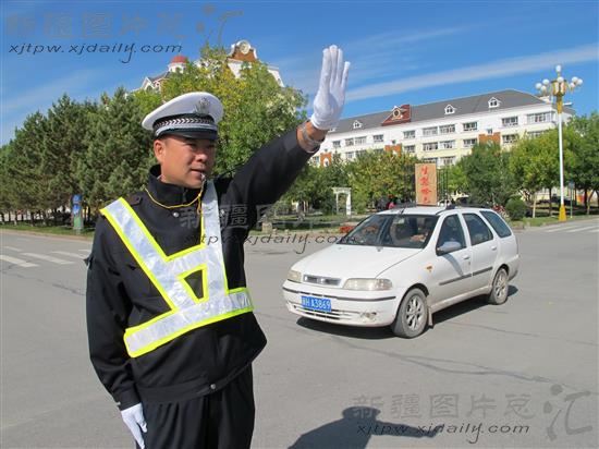 2013年9月20日,公安局领导在路上执勤。中秋小长假期间,新疆阿勒泰地区哈巴河县公安局党委班子成员替下交警在重要交通路口执勤,让交警回家与亲人团聚。