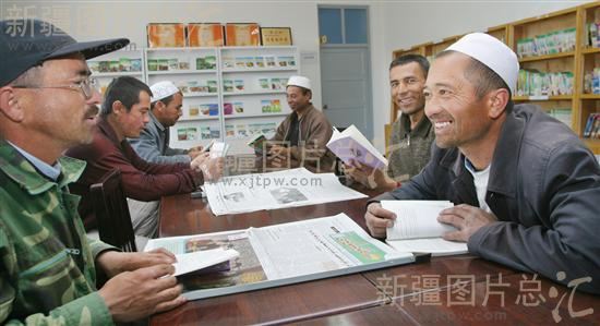 2008年4月26日,新疆克孜勒苏柯尔克孜自治州阿图什市松塔克乡的农民来到乡文化站阅读自己喜爱的书。现在,阿图什市乡乡都建起了标准化的文化站,村村都有文化室,每个站、室都配备有维吾尔文的党报党刊和农村实用技术读物,这些地方已成为广大农民学习科学文化知识的好场所。