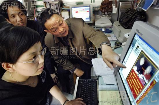 2008年4月14日,新疆巴音郭楞蒙古自治州库尔勒市市民陈伯寿(右)在一家电脑喷绘中心,指导编排自己新近制作的宣传版面。