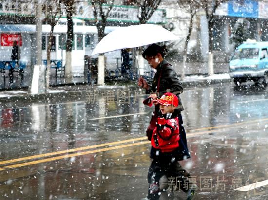 关键字:新疆 阿勒泰地区 阿勒泰市 雨伞 行走 儿童 母子 街道 雪花 雪中行 春雪