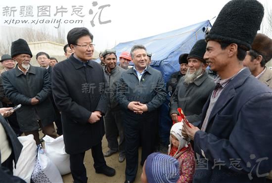 2014年3月19日,中共中央政治局委员、自治区党委书记张春贤,冒雪来到于田县阿羌乡皮什盖村,考察地震灾区的建设情况,并看望慰问了在地震中受灾的乡亲们。