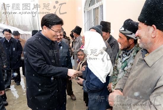 2014年3月19日,中共中央政治局委员、自治区党委书记张春贤,冒雪来到于田县阿羌乡皮什盖村,考察地震灾区的建设情况,并看望慰问了在地震中受灾的乡亲们。