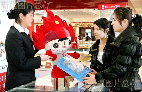 关键字:新疆 乌鲁木齐市 专卖店 售货员 顾客 奥运商品 奥运福娃 旅游纪念品 选购 特许专柜