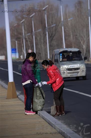 2014年3月22日,哈巴河县阿克齐镇民主中路社区的几名环卫志愿者正在清理道路两旁的垃圾。