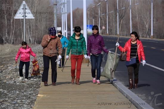 2014年3月22日,哈巴河县阿克齐镇民主中路社区的几名环卫志愿者正在清理道路两旁的垃圾。