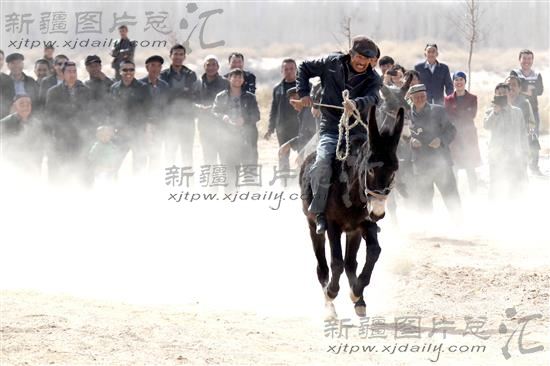 2014年3月20日,哈密市花园乡布茹村,各族群众在参与骑驴比赛,喜迎诺鲁孜节。