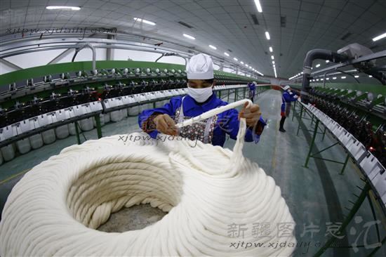 2014年3月22日,位于岳普湖县泰岳工业园区的新粤纺织有限公司企业生产车间,工人生产线上操作。
