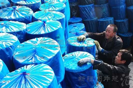2014年3月21日,新湖百迪塑料制品公司的工人准备将滴灌带送到农户家中。