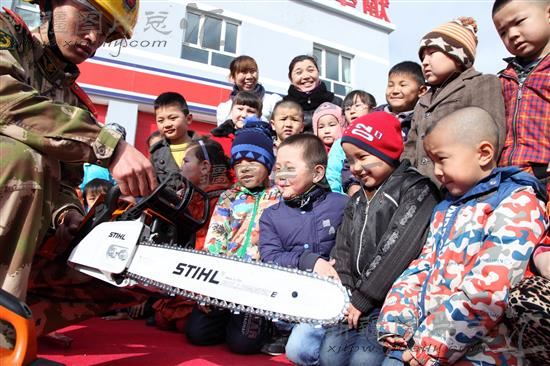 2014年3月26日,消防战士在为小朋友展示消防设备,向孩子们普及消防知识。