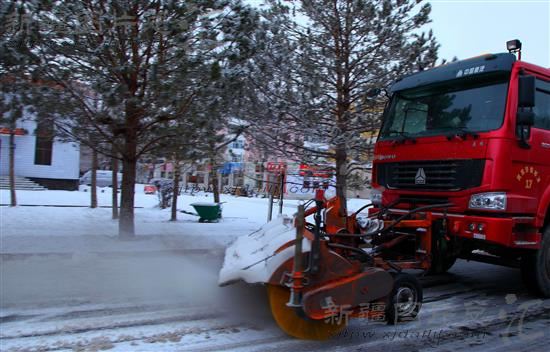 2014年3月26日,清雪车在清扫道路上的积雪。当日,受寒冷空气南下的影响,哈巴河县降下春雪。当日气温较25日最高气温下降了16摄氏度。