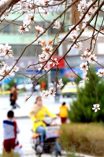 2014年3月26日,新疆哈密市街头杏花盛开。