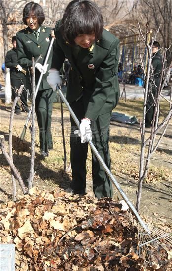2014年3月27日,两名退役女兵正在清理、拉运枯叶树枝,美化公园环境。