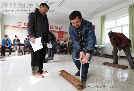 2014年3月7日,精河县茫丁乡北地村村民正在进行铸铁柱形散热器组对与安装培训。