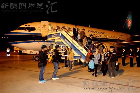 2014年3月30日,新疆哈密机场,旅客走下飞机。