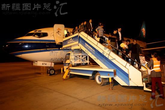 2014年3月30日,新疆哈密机场,旅客走下飞机。