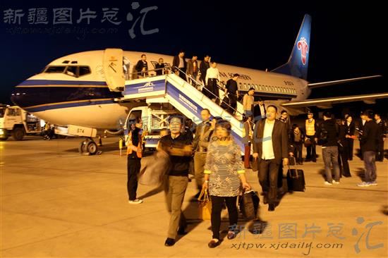 2014年3月30日,新疆哈密机场,旅客走下飞机。